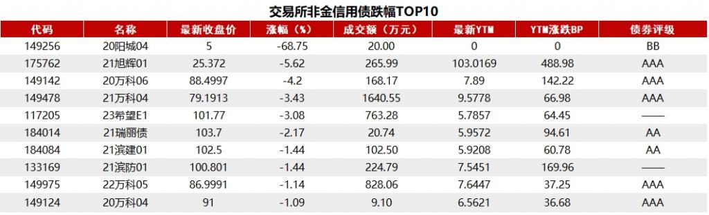 据 Choice 数据统计显示,今日交易所市场非金信用债跌幅排行前五的分别是:20 阳城 04、21 旭辉 01、20 万科 06、21 万科 04、23 希望 E1。具体如下:
