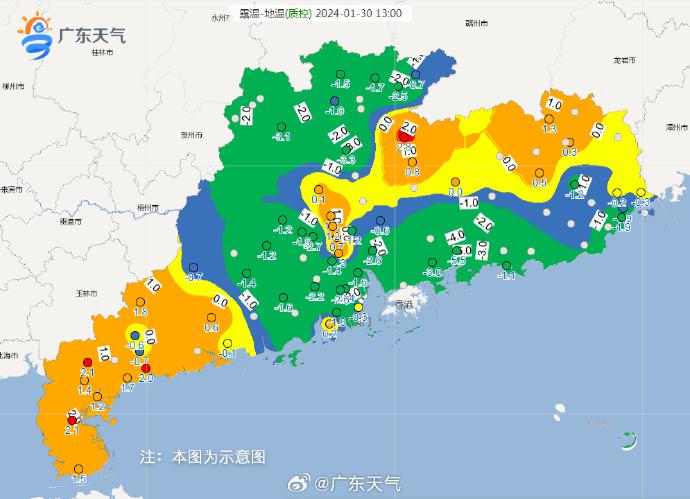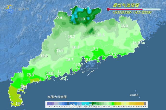 1 月 31 日,粤北阴天有分散小雨,其余市县阴天间多云局部有小雨。最低气温:粤北市县 13 ℃~15 ℃,南部市县 17 ℃~19 ℃,其余市县 15 ℃~17 ℃。