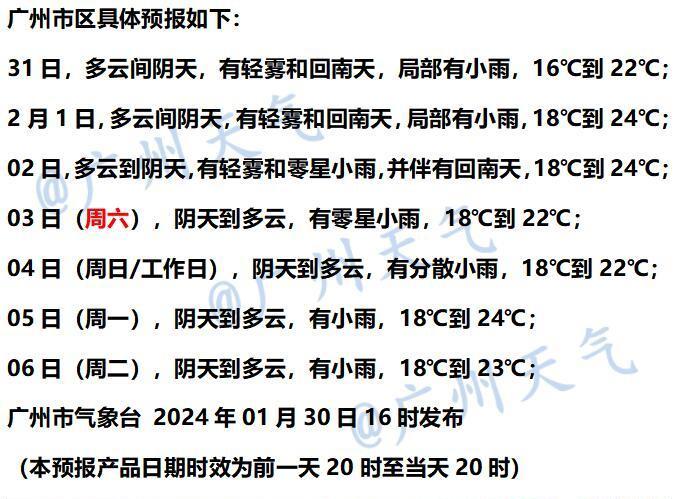 2 月 1 日 -2 日,粤北阴天有小雨或分散小雨,其余市县阴天间多云局部有小雨。最低气温:粤北市县 15 ℃~17 ℃,其余市县 18 ℃~20 ℃。
