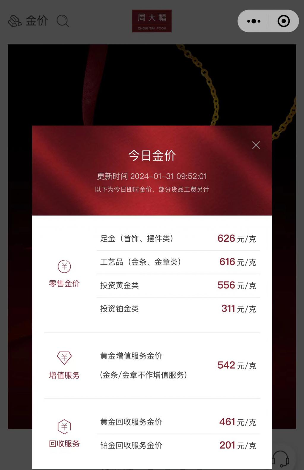 而截至 1 月 31 日 9 点 52 分,周大福给出的足金(首饰、摆件类)价格为 626 元 / 克,工艺品(金条、金章类)的价格为 616 元 / 克。相比于普通的足金首饰、黄金工艺品,其价格高出不少。