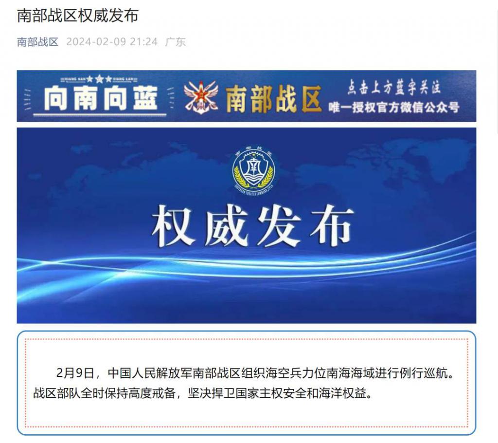 2 月 9 日,中国人民解放军南部战区组织海空兵力位南海海域进行例行巡航。战区部队全时保持高度戒备,坚决捍卫国家主权安全和海洋权益。