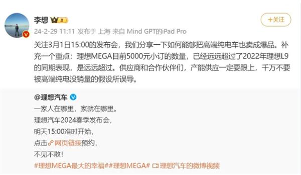 快科技 2 月 29 日消息,理想汽车 CEO 理想今日在微博发文表示,理想 MEGA 当前 5000 元的小订数量已经远远超过了 2022 年理想 L9 的同期表现。