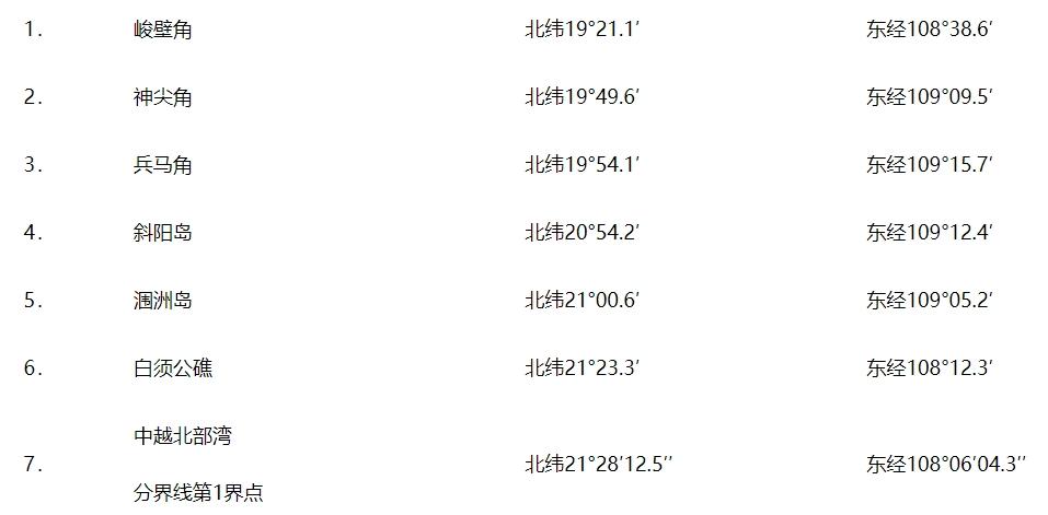 中华人民共和国政府根据一九九二年二月二十五日《中华人民共和国领海及毗连区法》,宣布中华人民共和国北部湾北部领海基线。