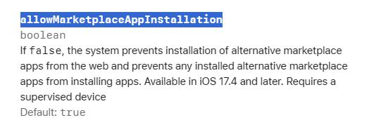 此外,IT 之家还注意到,企业可通过对员工 iPhone 的苹果移动设备管理描述文件进行配置,将 allowMarketplaceAppInstallation 一项设为 false,阻止通过第三方应用市场实现侧载。