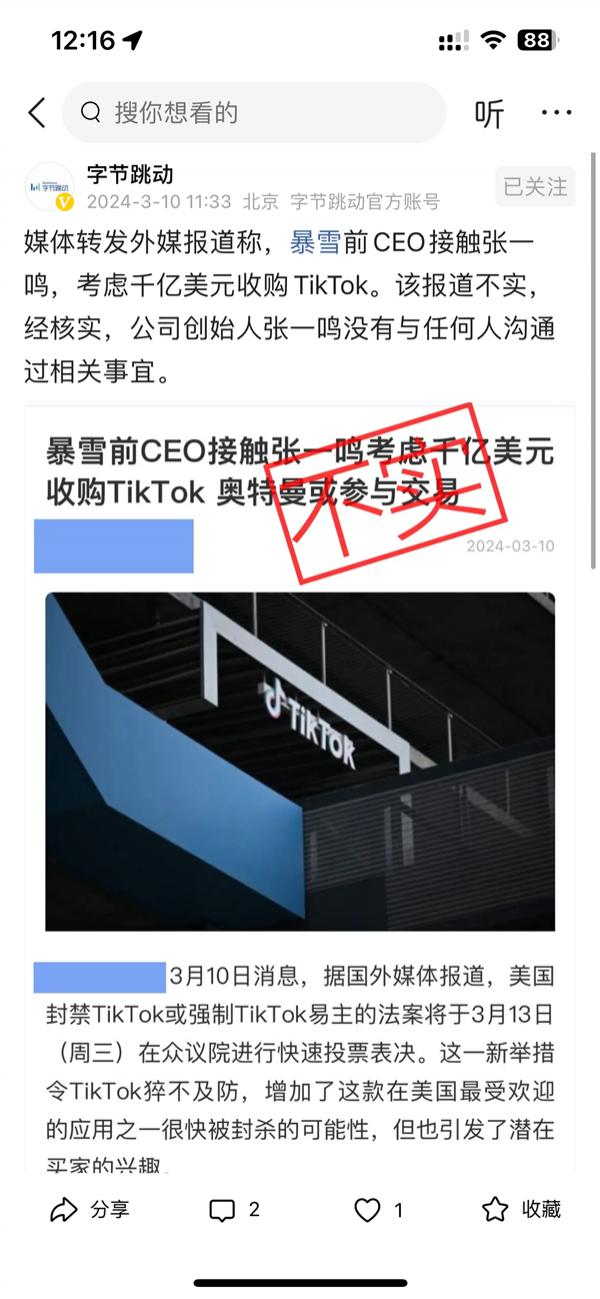 字节跳动否认暴雪前CEO接触张一鸣:考虑千亿美元收购TikTok不实