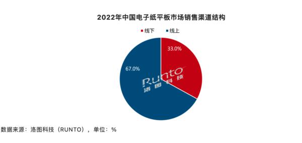 根据洛图科技发布的《中国电子纸平板零售市场月度追踪 ( China ePaper Pad Retail Market Monthly Tracker ) 》,2022 年,中国电子纸平板市场销量为 102 万台,占到全球市场的 9.3%。其中,线上渠道销量为 67.9 万台,占到整体市场的 67%。就数据方面来看,2022 年中国电子纸平板销量出现较快增长,市场进入到爆发阶段。