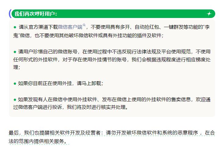 微信安全中心呼吁用户:从官方渠道下载微信客户端,不要使用具有多开、自动抢红包、一键群发等功能的 " 李鬼 " 微信,也不要使用其他破坏微信软件或具有外挂功能的插件及软件,如果你目前正在使用外挂,请马上卸载。