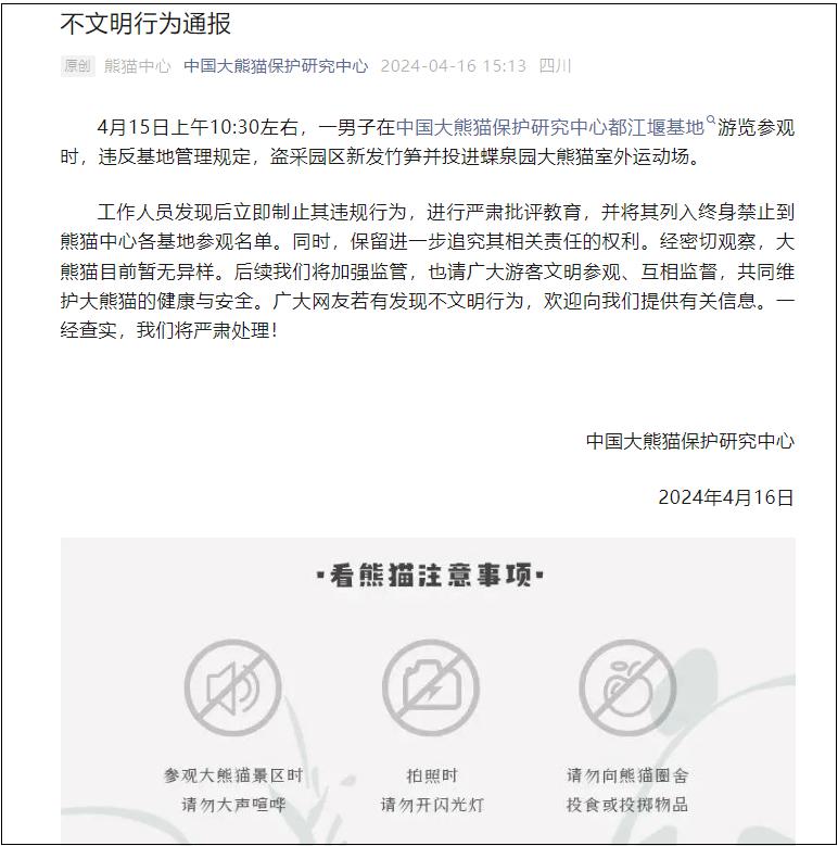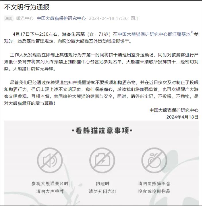 4 月 18 日,中国大熊猫保护研究中心发布不文明行为通报: