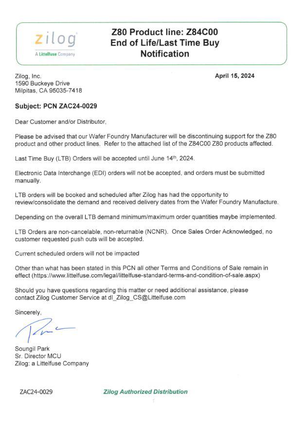 Zilog 将根据客户的需求处理和安排 Z80 的 " 最后购买 "LTB 订单,而 WFM 将随后提供实际交货日期。