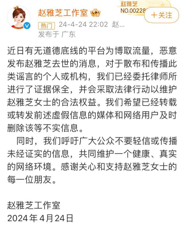 其工作室表示 " 近日有无道德底线的平台为博取流量,恶意发布赵雅芝去世的消息,对于散布和传播此类谣言的个人或机构,我们已经委托律师所进行了证据保全,并会采取法律行动以维护赵雅芝女士的合法权益。我们希望已经转载或转发前述虚假信息的媒体和网络用户及时删除该等不实信息。"