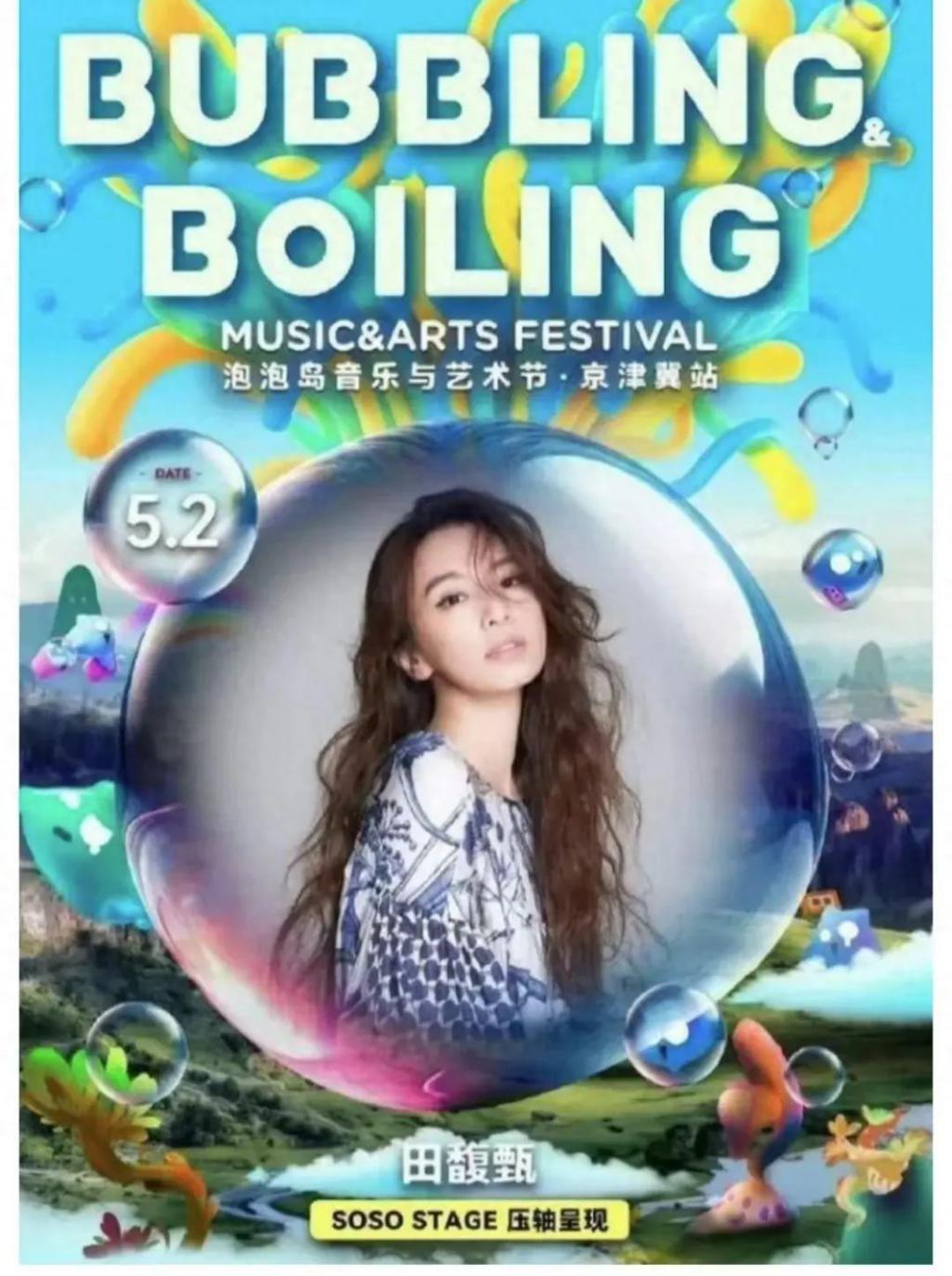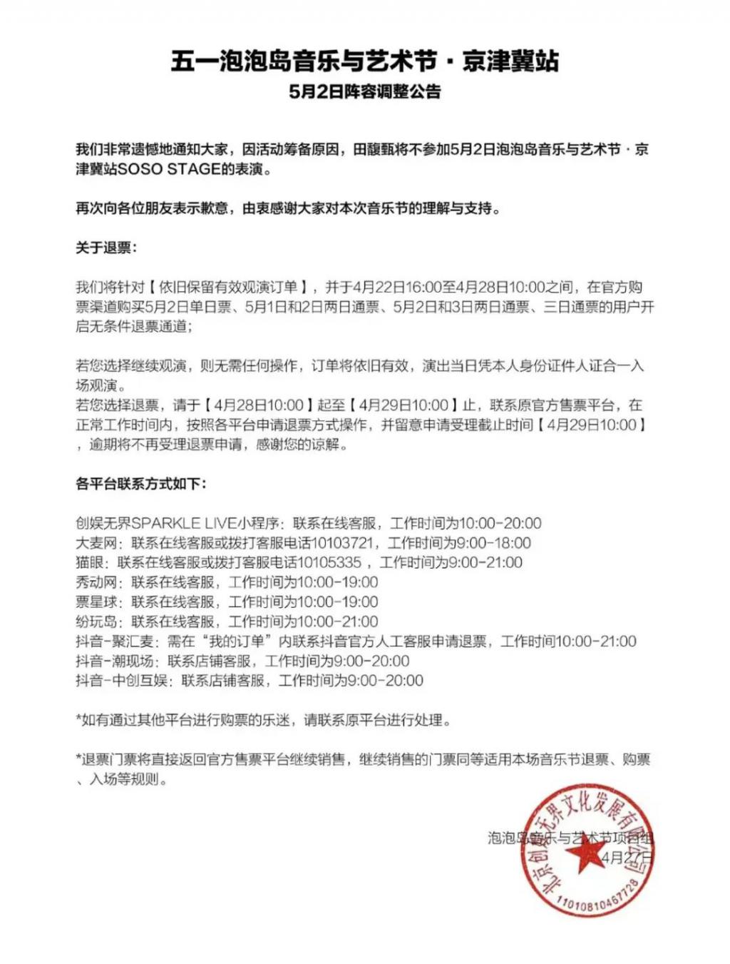 4 月 27 日,泡泡岛音乐与艺术节官微发布声明,称五一期间演出的阵容有所调整,因活动筹备等原因,歌手田馥甄将不参加表演,同时贴出了退票流程。此前该音乐节发布 5 月 2 日田馥甄将压轴进行演唱,不过一经发布,就引起了网友的大批抵制。