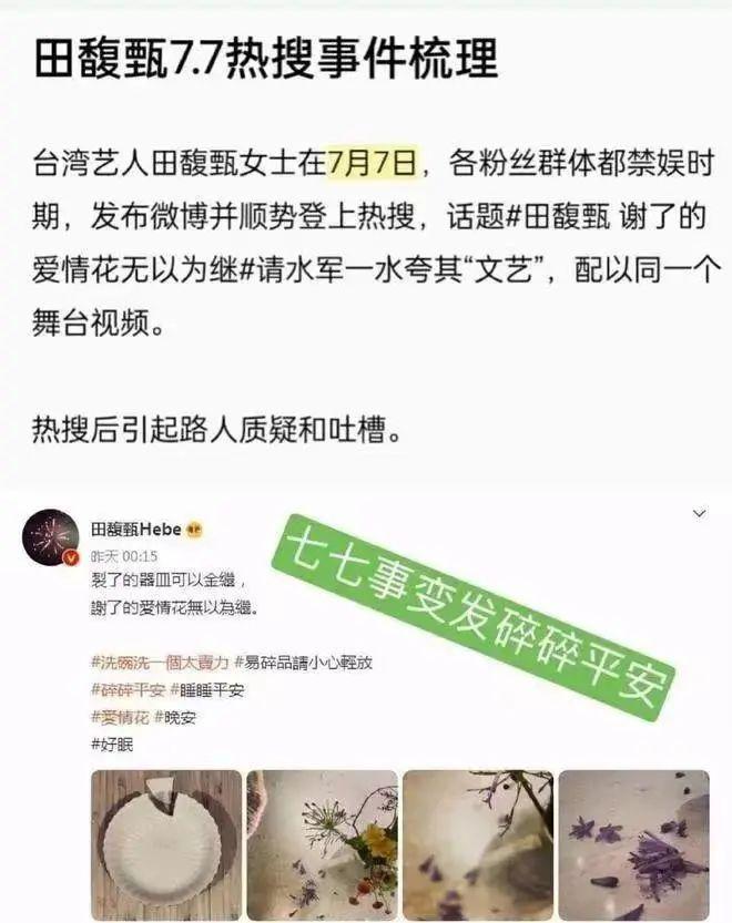 田馥甄女士在 7 月 7 日,各粉丝群体都禁娱时期,发布微博碎碎平安并顺势登上热搜,引起不少路人围观吐槽。