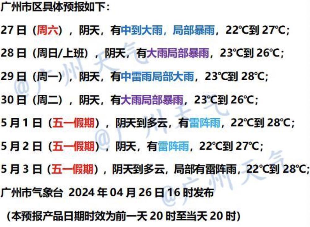 广州市气象台 4 月 26 日预计,受高空波动、偏南气流影响,27 日广州有中到大雨、局部暴雨,28 日有大雨局部暴雨;预计 27 日至 28 日的降雨集中时段为早晨和中午前后;预计 29 日广州有中雷雨局部大雨;预计 30 日受冷空气、切变线和高空槽影响,广州又有一次大雨局部暴雨过程。展望五一假期,影响广州的雨势有所减弱;根据广州市气象台 4 月 26 日预报,5 月 1 日至 3 日广州的雨势将减弱至雷阵雨。