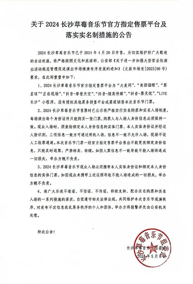 5 月 8 日,长沙草莓音乐节组委会发布了关于 2024 长沙草莓音乐节官方指定售票平台及落实实名制措施的公告。