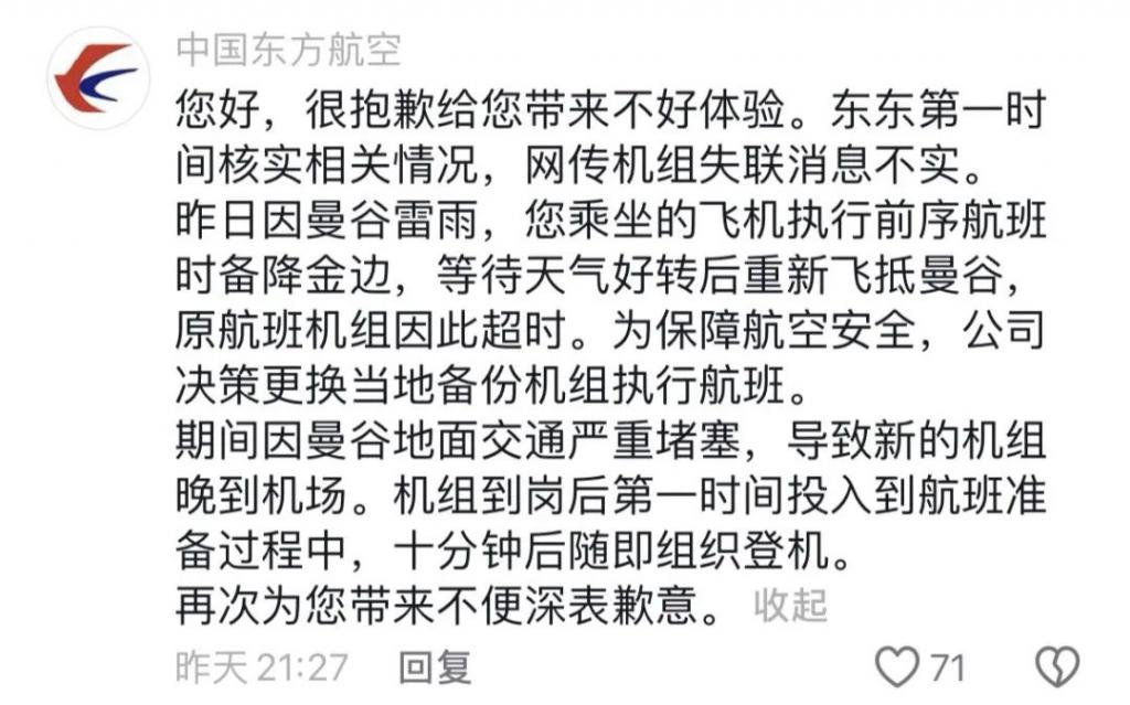 对此,5 月 14 日晚,中国东方航空官方账号在 " 摆烂兔兔 " 的评论区回应:网传机组失联消息不实,因曼谷雷雨致乘坐的飞机执行前序航班时备降金边,等待天气好转后重新飞抵曼谷,原航班机组因此超时。为保障航空安全,公司决策更换当地备份机组执行航班。其间因曼谷地面交通严重堵塞,导致新的机组晚到机场。