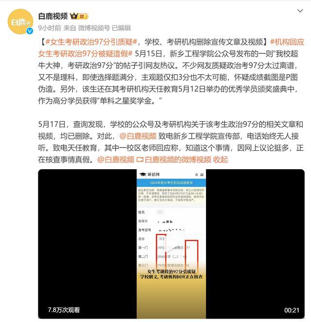 5 月 17 日,查询发现,学校的公众号及考研机构关于该考生政治 97 分的相关文章和视频,均已删除。对此,@白鹿视频 致电新乡工程学院宣传部,电话始终无人接听。致电天任教育,其中一校区老师回应称,知道这个事情,因网上议论挺多,正在核查事情真假。