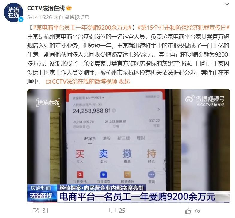 5 月 16 日消息,央视新闻频道《法治在线》节目 5 月 14 日报道了一起民企内部贪腐案:杭州某电商企业的一名员工,一年受贿 9200 万余元。
