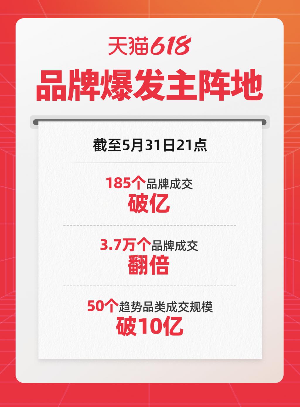 5 月 31 日晚 8 点,天猫 618 迎来第二波开卖,权益加码引发第二轮消费热潮,品牌成交再度爆发,截至 31 日晚 9 点,185 个品牌在天猫 618 成交破亿,超过 37000 个品牌成交翻倍,50 个趋势品类成交规模破 10 亿。