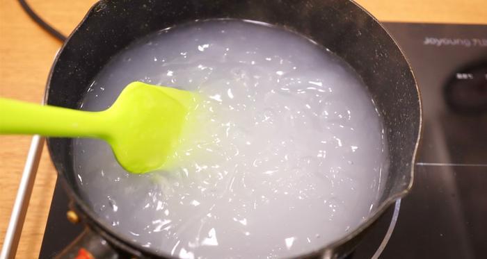 4、小心倒入搅拌好的豌豆粉水,边倒边搅拌,防止成块,在锅中小火煮开3分钟即可。