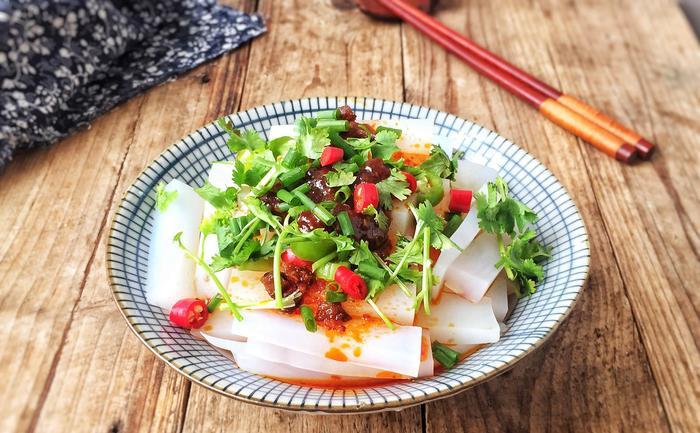 3、也可以切成块,用芝麻盐或者豆豉酱、葱花、蒜泥、酱油、香油、盐、醋、花椒面、辣椒油、味精、糖按自己的口味调成佐料,浇在凉粉上拌匀即可食用。