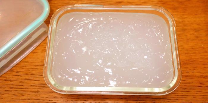6、把凉粉浆稍微抹平一下,然后放凉,盖上盖子,放入冰箱冷藏半天。