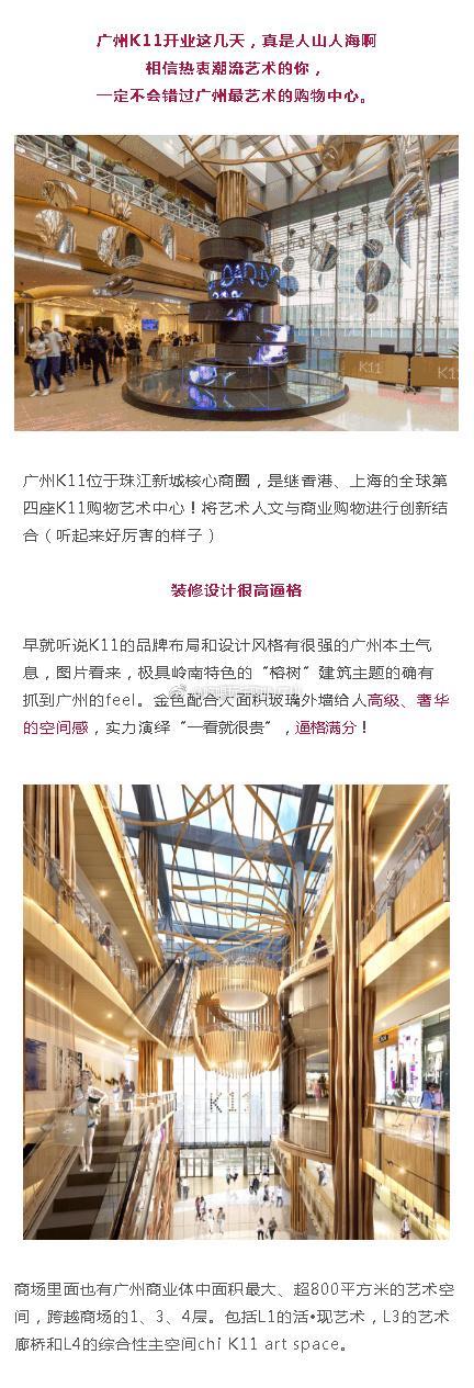 广州K11位于珠江新城核心商圈,是继香港、上海的全球第四座K11购物艺术中心,将艺术人文与商业购物进行创新结合,商场里设有广州商业体中面积最大、超800平方米的艺术空间,跨越商场的1、3、4层。