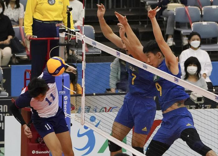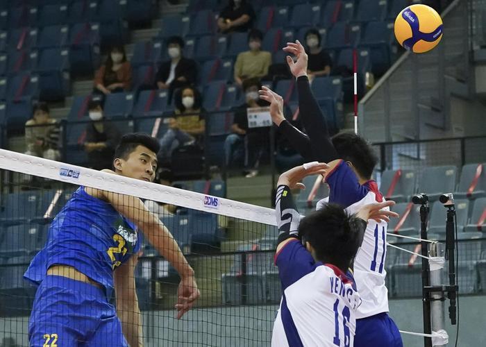 9月19日,中国队球员俞元泰(右)在比赛中扣球。新华社发(克里斯托弗·朱摄)