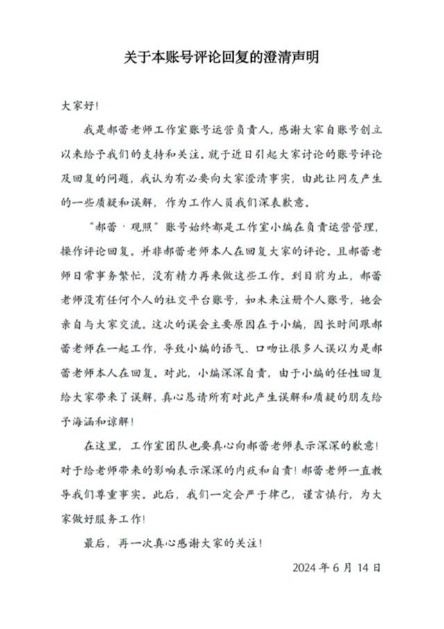 6 月 14 日,该工作室发声明称:" 郝蕾 · 观照 " 账号始终都是工作室小编在负责运营管理,并非郝蕾老师本人在回复大家的评论。到目前为止,郝蕾老师没有任何个人的社交平台账号。因长时间跟郝蕾老师在一起工作,导致小编的语气、口吻让很多人误以为是郝蕾老师本人在回复。