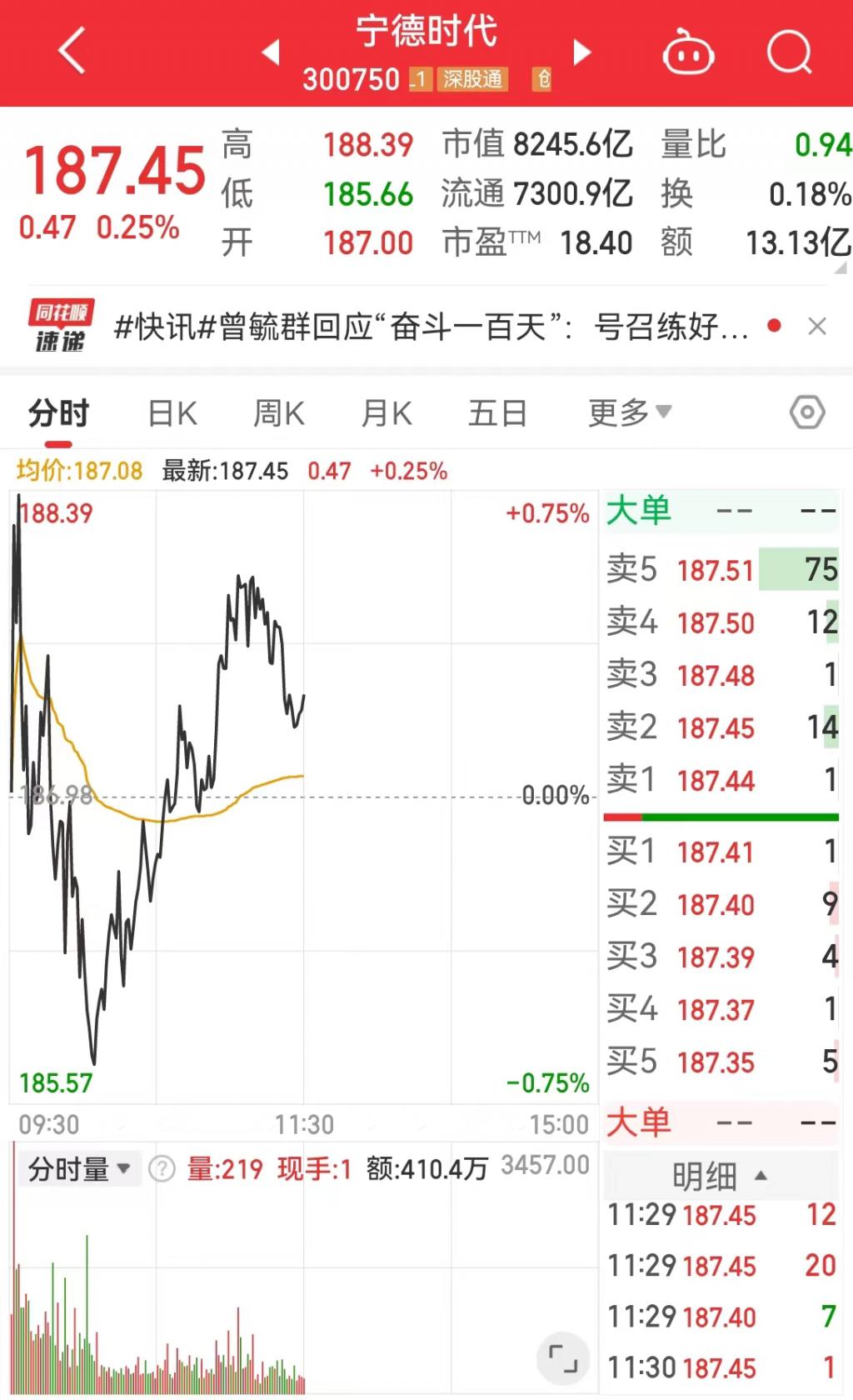截至 6 月 25 日午盘,宁德时代报 187.45 元,涨幅 0.25%,市值 8245.6 亿元。