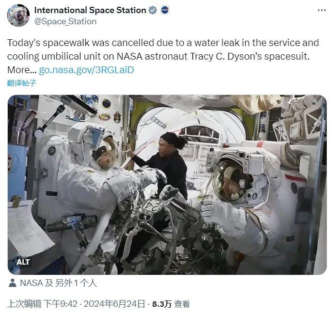 (由于太空服漏水,两人原定于本周一的出舱活动取消,来源:国际空间站)