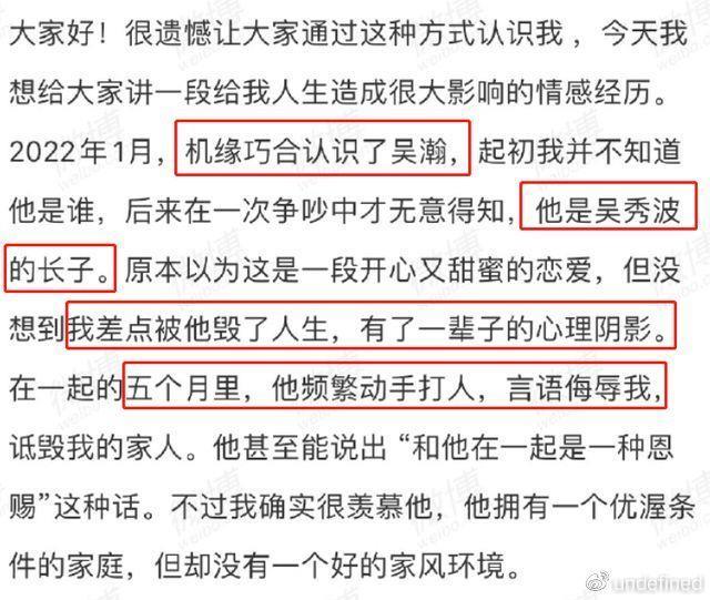 已经很久没有消息的吴秀波,家里又出现大新闻了,这次是他儿子吴瀚的前女友发长文爆料,自己在和吴瀚恋爱期间,多次被对方家暴,导致身上多处受伤,长期看心理医生,也依然难逃阴影。