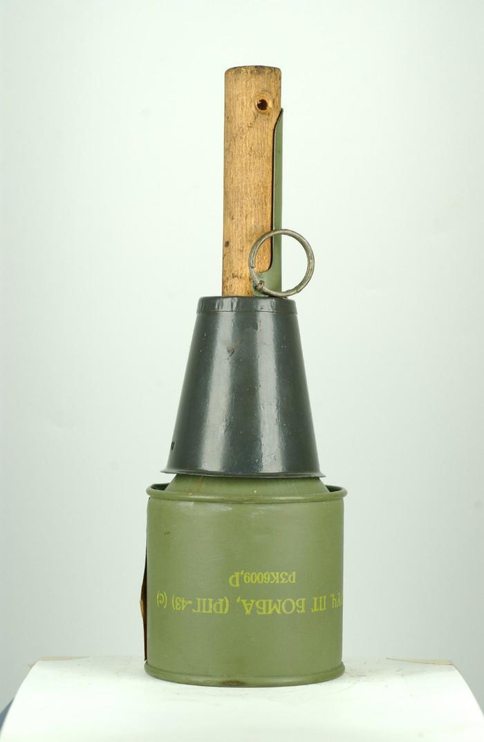 RPG-43式反坦克手榴弹,全弹长383毫米,战斗部直径93毫米,重量1200克,内装612克TNT炸药。比起普通的手榴弹,它的质量很大,所以需要很大的臂力才能投远,一般体力的士兵投掷距离在15-20米左右。由于投不远加上爆炸威力大,士兵在投出后必须隐蔽。
