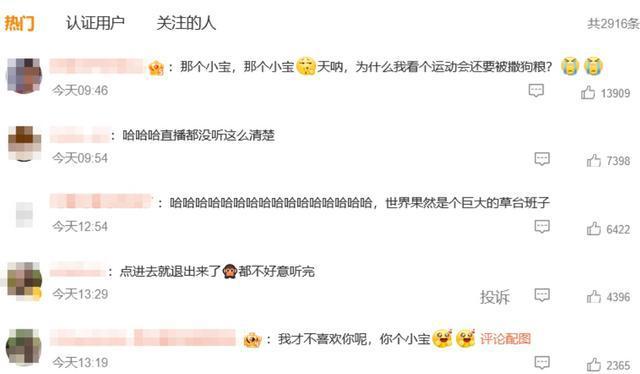 这段画面曝光后,相关话题登热搜榜,出稿前阅读量超 7451 万,众多网友热评:" 天呐,看个运动会还要被撒狗粮?"