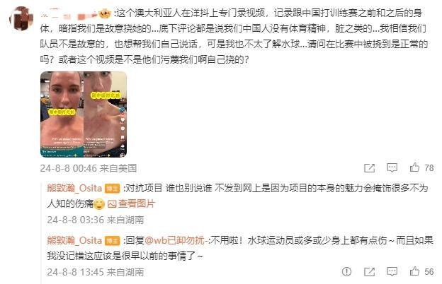 直播吧 08 月 09 日讯 有网友昨日到中国水球队长熊敦瀚总结巴黎奥运之旅的微博下留言,贴出澳大利亚水球选手卡恩斯此前在社媒发布的抱怨被中国队员在比赛中抓伤的视频截图。该网友询问熊敦瀚:" 请问在比赛中被挠到是正常的吗?或者这个视频是不是他们污蔑我们啊自己挠的?"