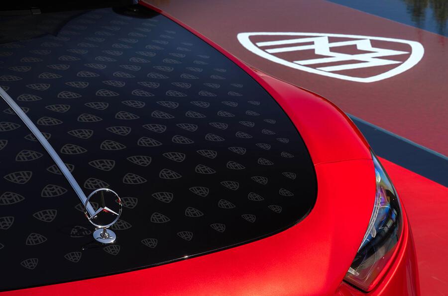 该车基于梅赛德斯 -AMG SL 跑车打造,采用了独特的红黑相间双色涂装,进气格栅也换成了迈巴赫标志性的镀铬竖条 " 大嘴 "。新车前大灯采用玫瑰金色细节装饰,挡风玻璃周围采用镀铬装饰,侧门槛上也有镀铬细节,还有一个定制的前分流器。该车提供两款 21 英寸轮毂供选择,包含五孔单体轮毂、样式更复杂的多辐轮毂。