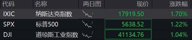 受此影响,美股三大指数集体上涨,道琼斯指数涨 1.01%,标普 500 指数涨 1.23%,纳斯达克指数涨 1.75%。