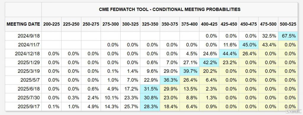 市场加大了 9 月降息 50 基点的押注,预计降息 25 基点的概率为 67.5%,降息 50 基点的概率为 32.5%;