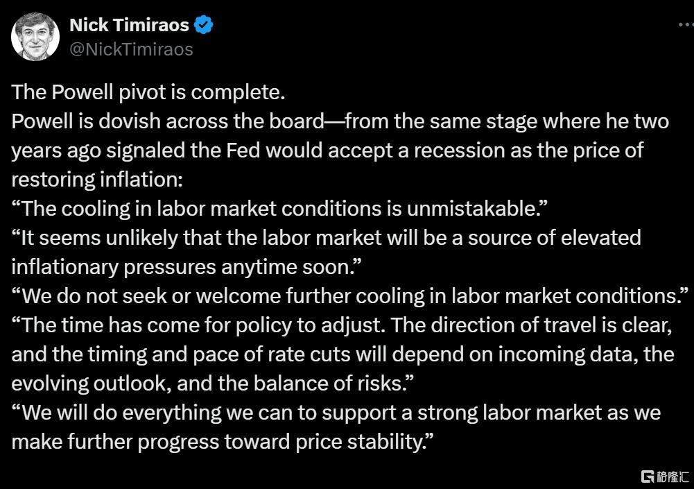 今晚,在全球央行年会上,鲍威尔明确表示:" 是时候调整政策了,不寻求或欢迎就业市场继续降温,我对通胀降至 2% 的信心已经增强。"