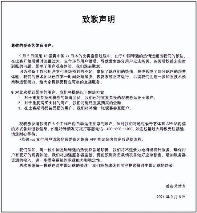 9 月 6 日晚,@爱奇艺体育 再次致歉,提供以下解决方案: