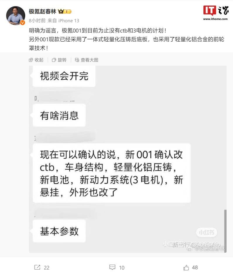 IT 之家 9 月 14 日消息,极氪智能科技副总裁赵春林今天在微博发文,对近期 " 新 001 确认改 CTB / 三电机 " 传闻进行否认:" 明确为谣言,极氪 001 到目前为止没有 CTB 和三电机的计划!另外 001 现款已经采用了一体式轻量化压铸后底板,也采用了轻量化铝合金的前轮罩技术!"