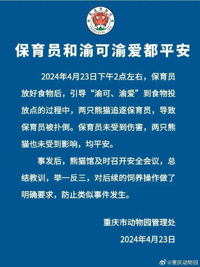 23 日晚,重庆动物园官博就熊猫扑倒保育员报平安,全文如下:
