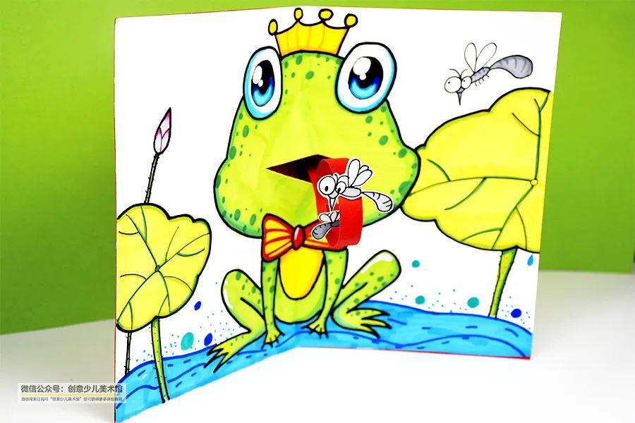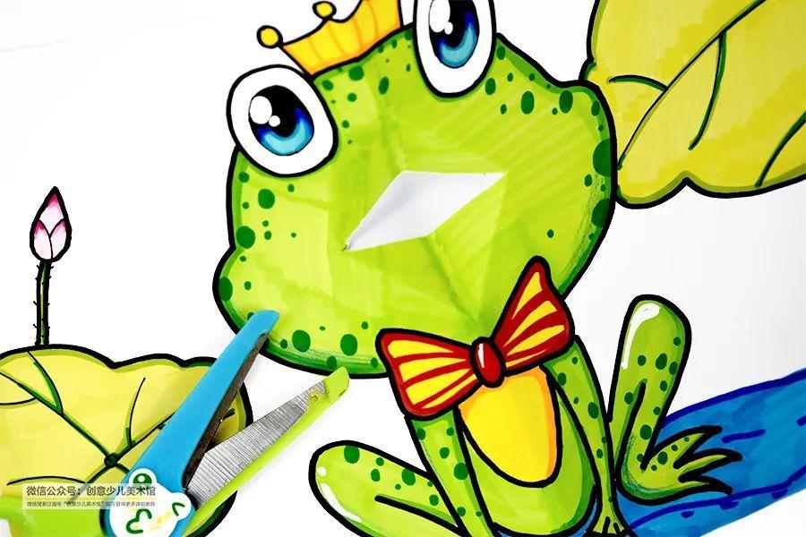 展开丰富的想象,青蛙它在哪里呢?它在做什么呢?小青蛙它在荷叶上,在捕捉害虫,我们在画面中表现出它的外形和生活环境,并用简单有趣的方法来表现青蛙捕捉害虫的场景,大大的嘴巴一张一合,非常有趣!