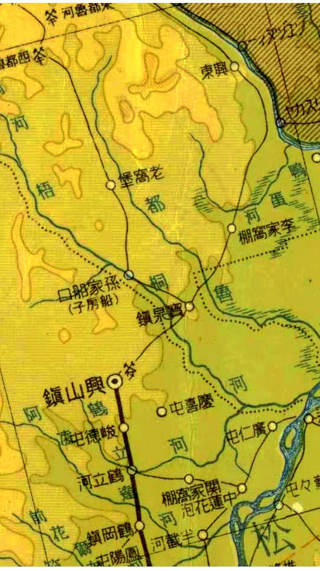 上图是《萝北县志》1982版记载的宝泉岭村。但是,宝泉岭、烟筒山、延兴村屯的今名或位置记录与实际有误差。之所以有误差,多因清末、民国地图的地图绘制技术有关(见下图),或因编者不熟悉农垦系统地名所致。而伪《满洲国地图》(下段图)都是经当时日本满洲铁道株式会社测量绘制的比例尺地图,相对地形地貌\位置更准确。从测量精准的地图上可见,二十世纪初日本政府侵占东三省的野心是筹谋已久。