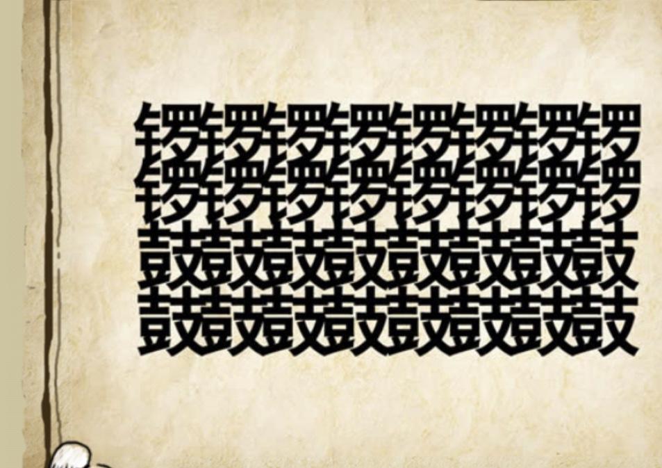 这里有很多的字。这让我想到一个成语:鸣金收兵。古代如果要进攻,就会击鼓,因为鼓声有气势,与鼓有关的成语还有一鼓作气等。这个成语也时与鼓有关呢。希望你能猜得到。