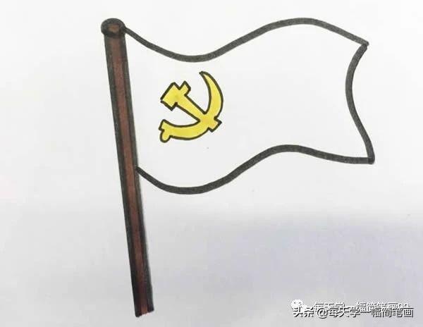 先画出一根笔直的旗杆,往右将整旗面的轮廓画出来后,在旗面的左上方位置画出由镰刀和锤头组合成的中国共产党的党徽图案,旗杆用棕色涂上,将党徽涂上黄颜色,最后给旗面涂红,底部线条加重颜色阴影,一面飘扬着的党旗就画好啦。