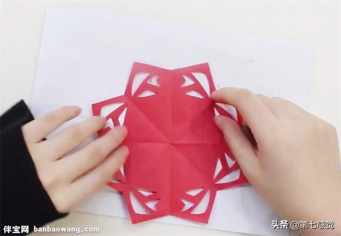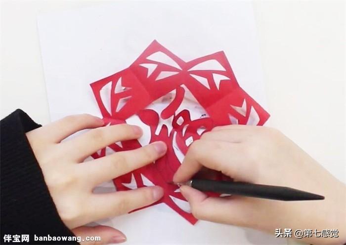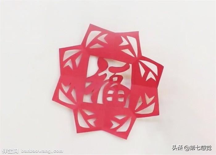 首先准备一张红色正方形彩纸,将彩纸沿斜角对折三次,用笔画出要裁剪的纹理,然后按照纹理裁剪,将彩纸展开,在中间的部分裁剪出一个福字,简单的福字窗花剪纸就完成啦。