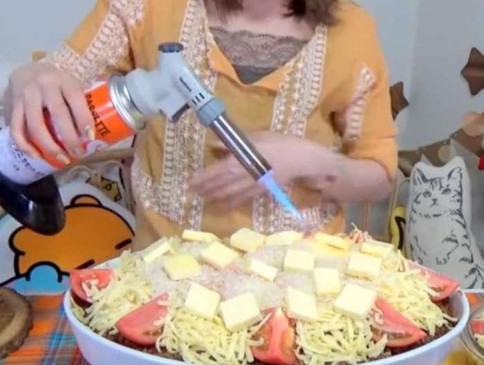 根据视频上显示这十五桶咖喱饭做熟了以后放在了一起,用一个大盆盛着,这个分量看上去就感觉快要饱了。而吃咖喱饭时要用到的芝士黄油这位彪悍的木下小姐直接就用火枪把这些芝士和黄油融化了,做好这些以后,木下小姐就开吃了,咖喱饭和鸡蛋芝士一起吃看起来色香味俱全,16斤重芝士咖喱饭,日本大胃王木下一扫而光。