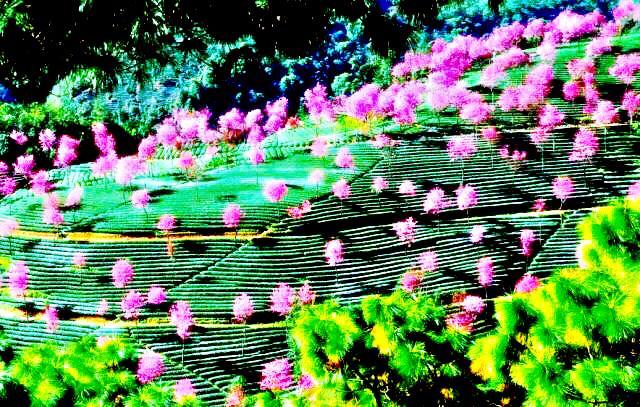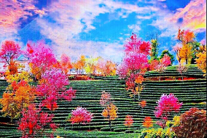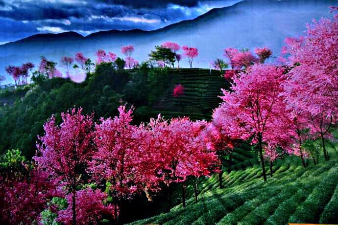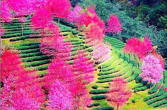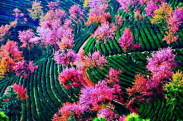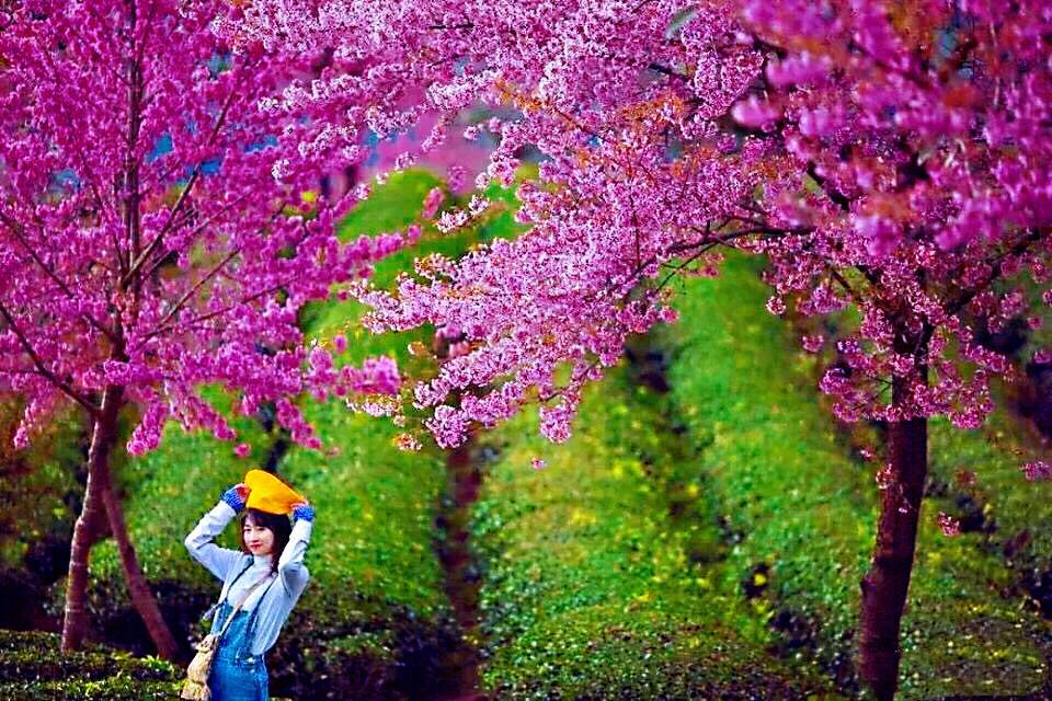 漫步在碧波翻滚,新绿映衬下,如霞似火的粉色冬樱花,远远望去,一株株樱花与层层茶田相得益彰,谱写着绿茶红樱,相恋相守的浪漫乐章。
