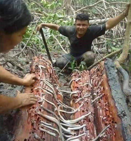 当地人会乘坐小船找到沼泽或河边枯木,锯开有船蛆的树干,一条条白色的虫子就是船蛆。