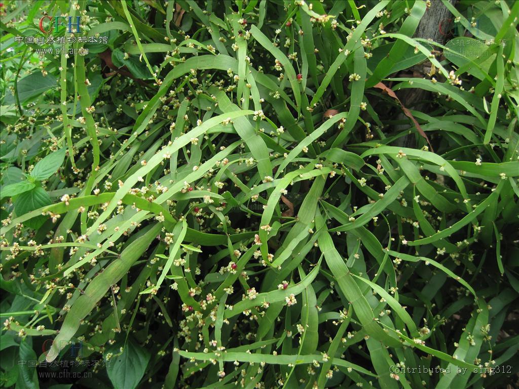 原形态多年生直立草本,高0.6~2米。茎基部圆柱形,木质化,上部枝扁平,呈带状,宽7~12毫米,深绿色,具光泽,有显着的细线条,节处略收缩,托叶鞘退化成线状,分枝基部较窄,先端锐尖。叶多生于新枝上,互生,菱状卵形,长4~20毫米,宽2~10毫米,先端渐尖,基部楔形,全缘或在近基部有一对锯齿,羽状网脉,无柄。花小,两性,具纤细柄;苞片腆质,淡黄棕色;花被4~5深裂,裂片矩圆形,长约1毫米,淡绿色,后变红色;雄蕊6~7,花丝扁,花药白色;雌蕊1,子房上位,花柱短,3枚,杜头分叉。疫果三角形,包于红色内质的花被内。花期9~10月。果期10~11月。